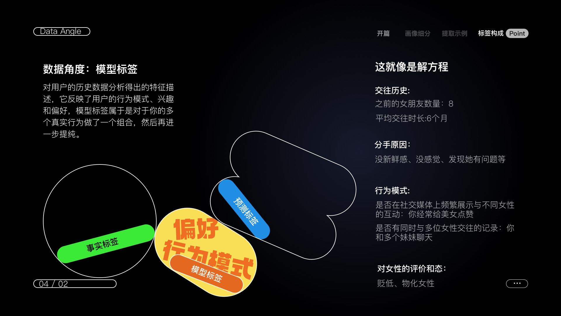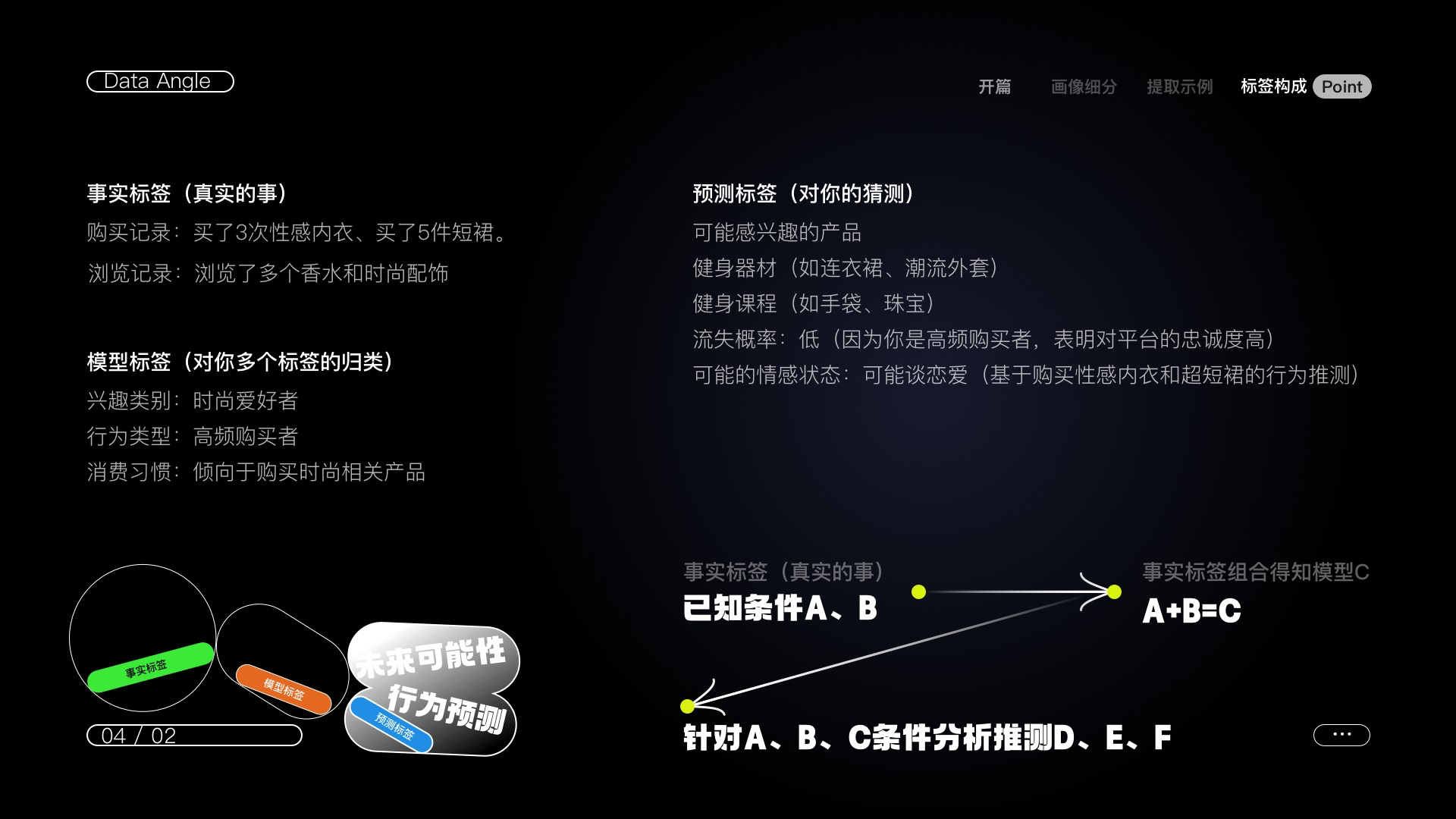 比如說你閨蜜是一個漂亮妹妹,情緒穩(wěn)定,平時也不介入你的情感生活(靜態(tài)標(biāo)簽:女、情緒穩(wěn)定、無男友)但在某次你和她吐槽你男票時她情緒變得無比激動痛罵渣男并極力勸你分手?。▌討B(tài)標(biāo)簽:情緒激動、強(qiáng)烈反應(yīng)、關(guān)心朋友)那你會不會懷疑她想搞定你男票?(預(yù)測標(biāo)簽:對你男朋友的潛在興趣、對感情的需求)靜態(tài)標(biāo)簽為我們提供了閨蜜的基本信息,動態(tài)標(biāo)簽反映了她在特定情境下的行為變化,預(yù)測標(biāo)簽則對她的潛在需求和動機(jī)進(jìn)行了推測。這種分析能夠幫助我們更好地理解她的行為和可能的心理狀態(tài)。(故事胡編的、如有雷同純屬巧合)
