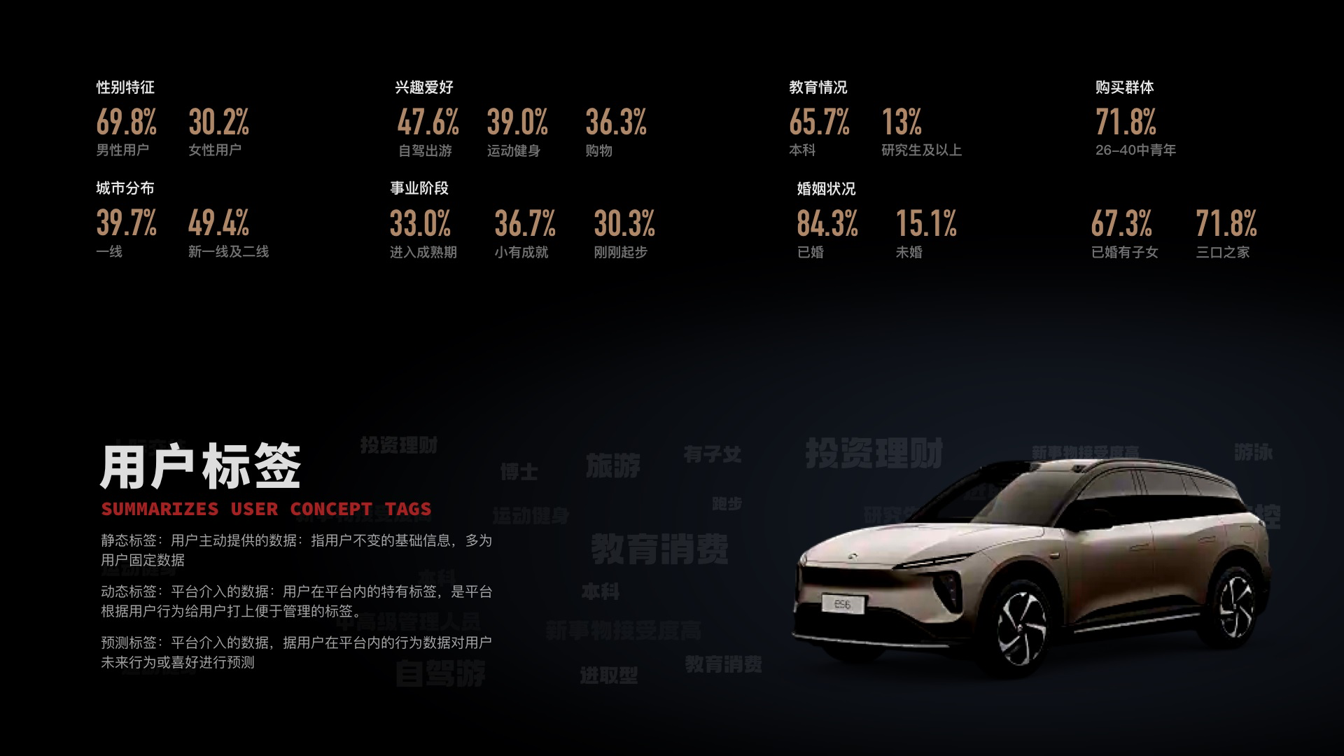 用戶主動提供的數(shù)據(jù),或者你通過手段獲取的數(shù)據(jù),一般來說是用戶不咋變的信息,姓名、性別、年齡、身高、體重、職業(yè)、興趣愛好、情感狀態(tài)、所在地區(qū)、設(shè)備信息、手機(jī)號等等。大概率不會變的信息,總不會今天你是男,明天變成女吧?靜態(tài)標(biāo)簽主要用來了解咱們用戶的基礎(chǔ)需求。