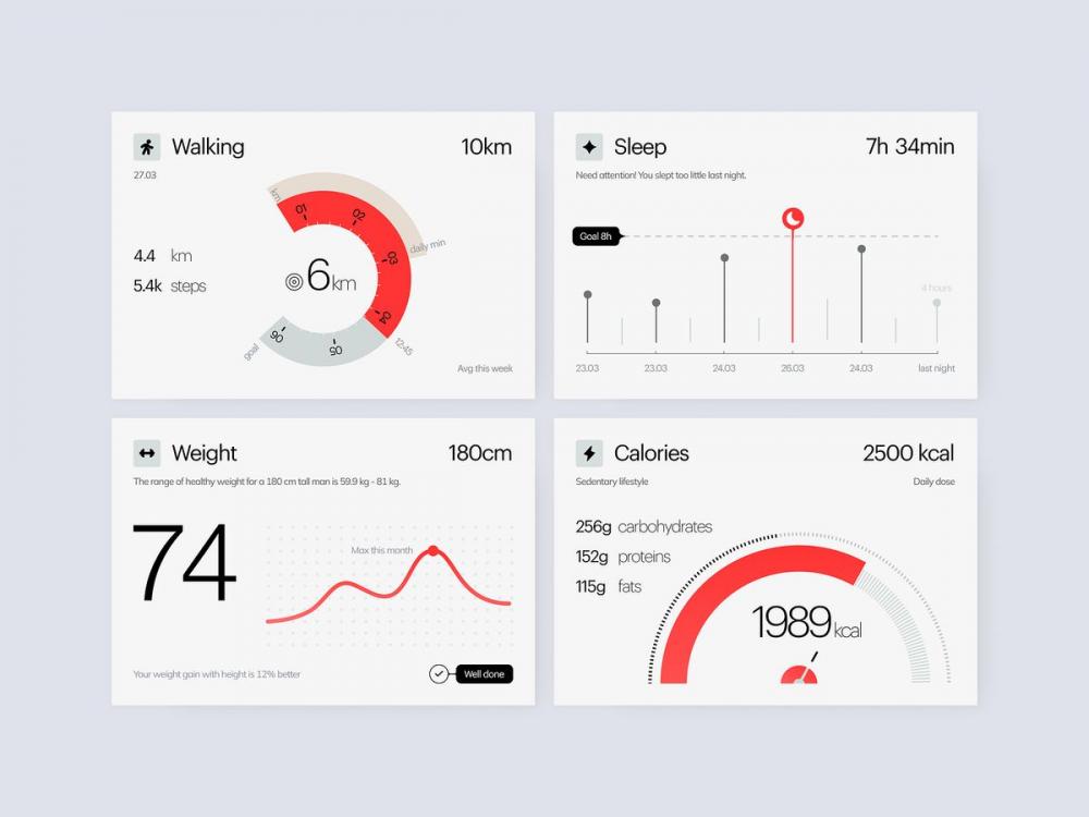 - 信息分層:核心數(shù)據(jù)(步數(shù)、體重)突出展示,輔助數(shù)據(jù)(熱量、睡眠)有序排布,避免信息過(guò)載。