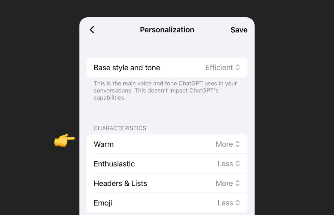 案例3:ChatGPT推出多維度人格參數(shù)調(diào)節(jié)滑塊,通過(guò)檔位化控制實(shí)現(xiàn)交互風(fēng)格的精準(zhǔn)適配,標(biāo)志著AI對(duì)話系統(tǒng)從統(tǒng)一輸出轉(zhuǎn)向用戶(hù)主導(dǎo)的個(gè)性化體驗(yàn)設(shè)計(jì)。