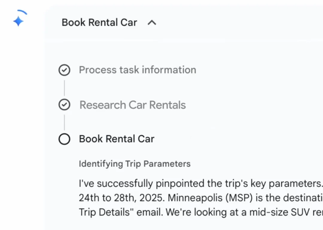 案例1:Gemini Agent上線租車(chē)功能,支持自動(dòng)比價(jià)、讀取郵箱及租車(chē)服務(wù)預(yù)訂,AI正逐步進(jìn)入端到端的生活服務(wù)領(lǐng)域。