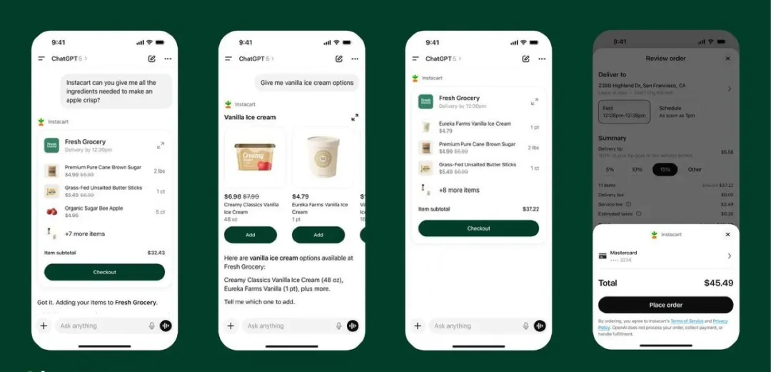 案例2:OpenAI與Instacart合作,將“買(mǎi)菜”功能接入ChatGPT。用戶(hù)可在聊天中一邊討論菜譜,一邊生成購(gòu)物清單,并直接完成結(jié)賬,全程無(wú)需跳轉(zhuǎn)應(yīng)用。