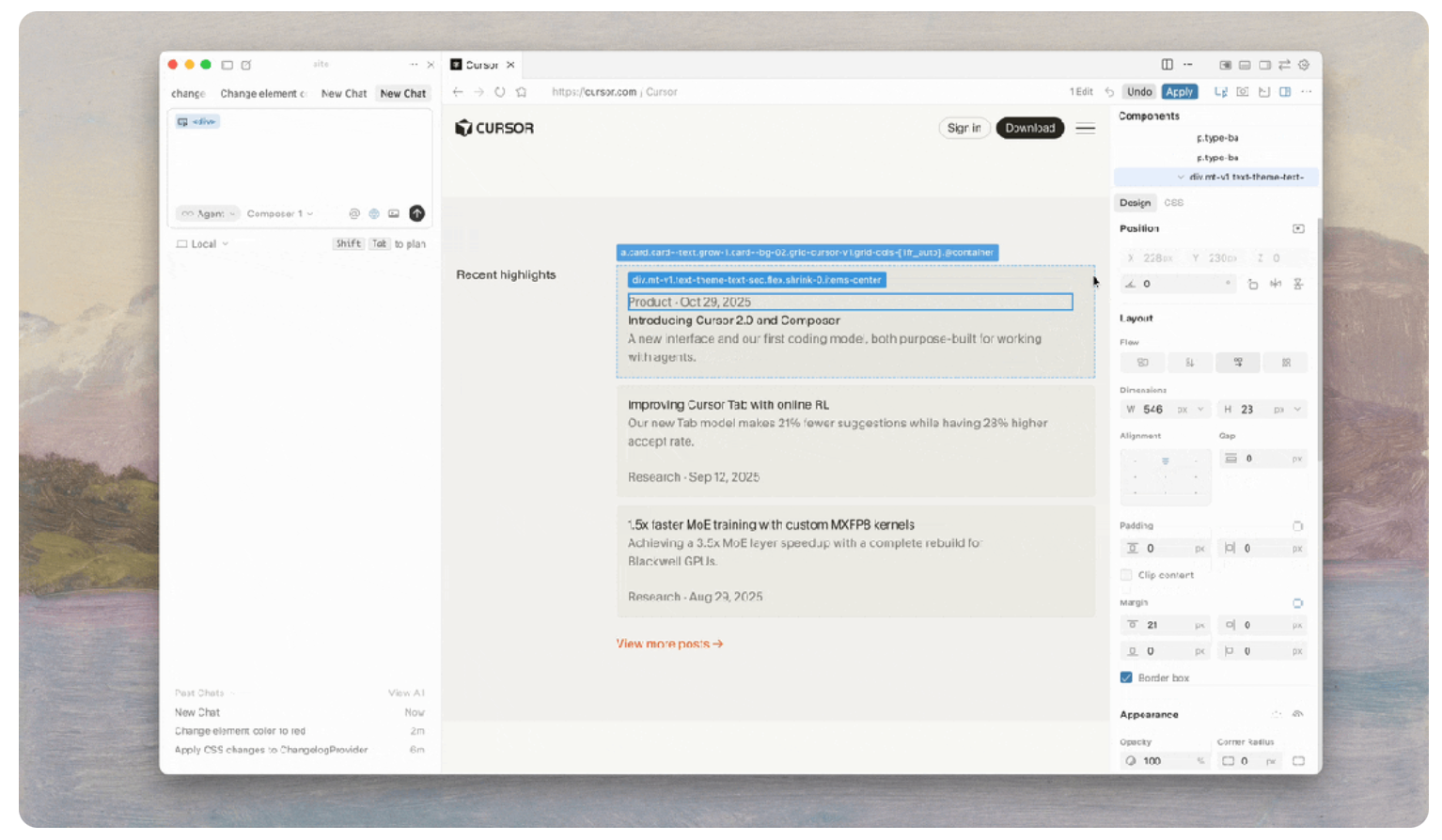 案例3:Cursor為Cursor Browser推出全新可視化編輯器,將網(wǎng)頁(yè)、代碼與視覺(jué)編輯工具整合在同一窗口,支持拖拽調(diào)整界面、直接查看組件屬性與樣式,并通過(guò)自然語(yǔ)言指令快速修改,自動(dòng)同步至底層代碼。