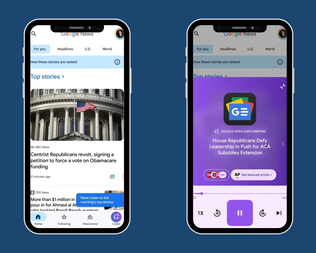 案例5:Google在Android版Google News中加入AI播客功能,將新聞自動(dòng)轉(zhuǎn)化為可收聽(tīng)內(nèi)容,拓展了通勤、碎片時(shí)間等場(chǎng)景下的新聞消費(fèi)方式。
