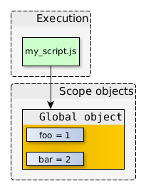 在上面的代碼中,我們有一個(gè)執(zhí)行的上下文(myscript.js自身的代碼),以及它所引用的作用域?qū)ο?。全局?duì)象里面還含有很多不同的屬性,在這里我們就忽略掉了。