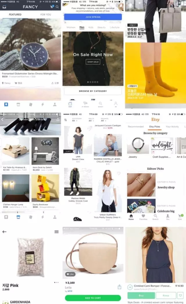 接下來我們就需要對(duì)這些 apps 進(jìn)行視覺風(fēng)格上的拆分,來看看到底是哪些視覺表現(xiàn)讓大家覺得它們是時(shí)尚、簡(jiǎn)潔的。我們可以依據(jù)經(jīng)驗(yàn)對(duì)視覺表現(xiàn)劃分幾個(gè)維度(比如以下幾個(gè)),接下來我將以購(gòu)物應(yīng)用為例,從以上幾個(gè)維度來示意分析的方法。