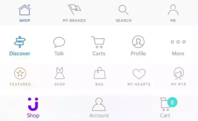 每款APP都需要一套易于識(shí)別的 icon來輔助信息展示。雖然在這一塊設(shè)計(jì)師的話語權(quán)更強(qiáng),但我也見過不少因?yàn)?/span>icon的設(shè)計(jì)風(fēng)格而吵得不可開交。就拿是填色icon還是線條 icon來說,我們把準(zhǔn)備的幾款 APP拉出來看一下就知道了。就當(dāng)前情況來看,線條icon更符合大家對(duì)于時(shí)尚、簡(jiǎn)潔的理解。