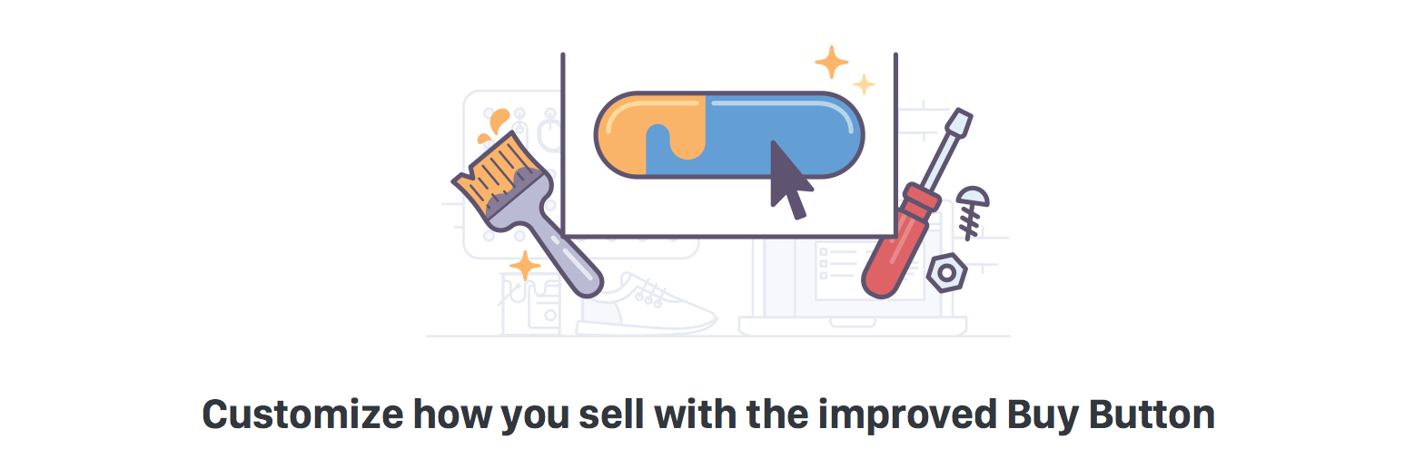 這個元素與那個元素融合,就能表達我們想要傳遞的內(nèi)容??赡苓@類比喻使用起來需要更老道的經(jīng)驗,但在產(chǎn)品插畫里的確更受重視,或者說一般設(shè)計都會考慮它,因為它是讓用戶獲知你的產(chǎn)品或功能賣點的捷徑。如下圖所示,沒錯,你知道我們提供了“購買”的按鈕,但瞧瞧旁邊擺放的畫筆,基于對畫筆的了解,你就會明白你能定制“購買”按鈕的顏色。將刷子的功能與按鈕的功能混合起來,刷子可以自定義顏色,因此我們的按鈕也可以。與品牌和營銷設(shè)計一樣,這種比喻在圖標(biāo)設(shè)計中也時常出現(xiàn)。