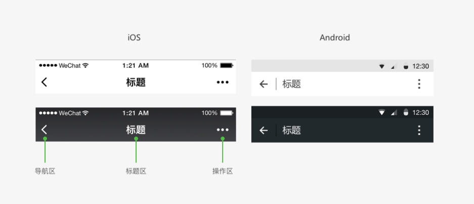 微信導(dǎo)航欄分為導(dǎo)航區(qū)域、標(biāo)題區(qū)域以及操作區(qū)域。其中導(dǎo)航區(qū)控制程序頁面進(jìn)程。目前導(dǎo)航欄分深淺兩種基本配色,在iOS和Android展示有所不同,如下圖所示: