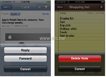 屏幕的底部一般是輔助性的工具欄或切換視圖使用的頁簽欄。一些影響較大的操作如果出現(xiàn)在屏幕下半?yún)^(qū)域,必須仔細考慮它們的排列設(shè)計。如圖5.1,一 般情況下,操作面板的取消按鈕放在最后,這樣可以鼓勵用戶閱讀完所有的選項,暗藍色的返回按鈕可以和一般的按鈕區(qū)分開來,即便用戶沒閱讀完也知道這是返回 按鈕。對于一些影響較大的操作(如刪除),將其放在面板的頂部是最好的,因為頂部更容易被看到,再加上紅色的警告暗示,用戶選擇起來會更為慎重。