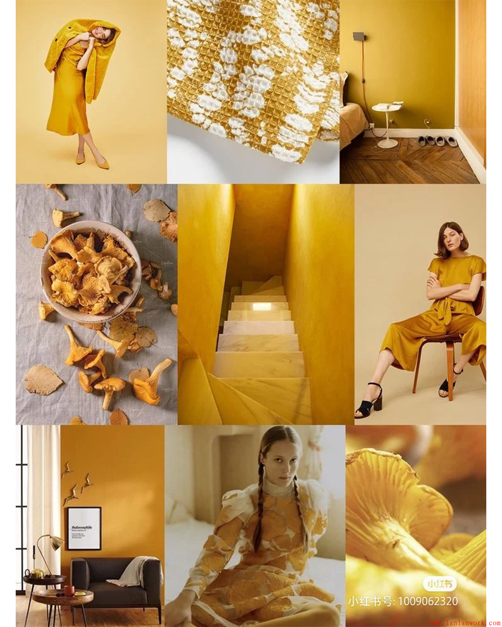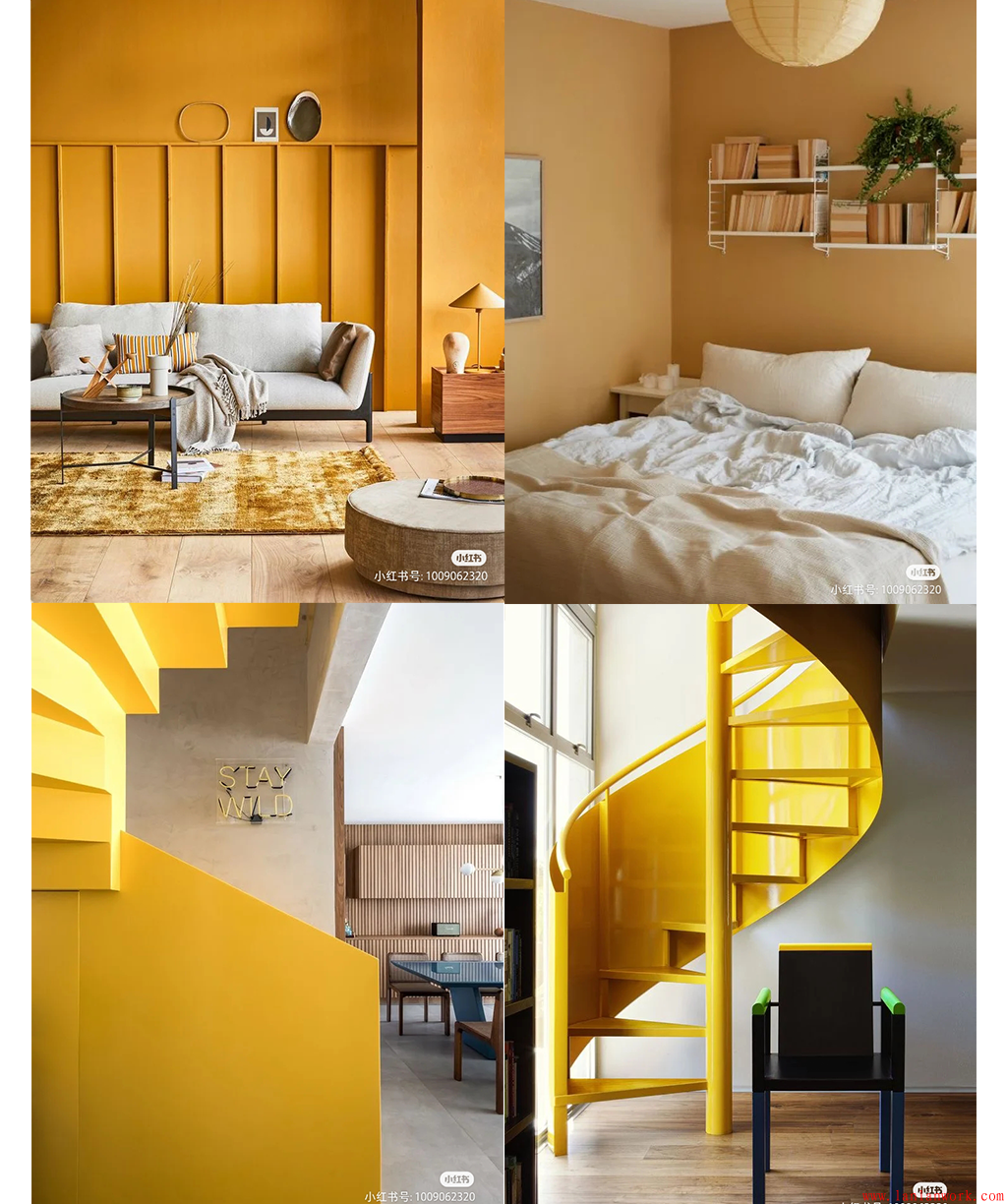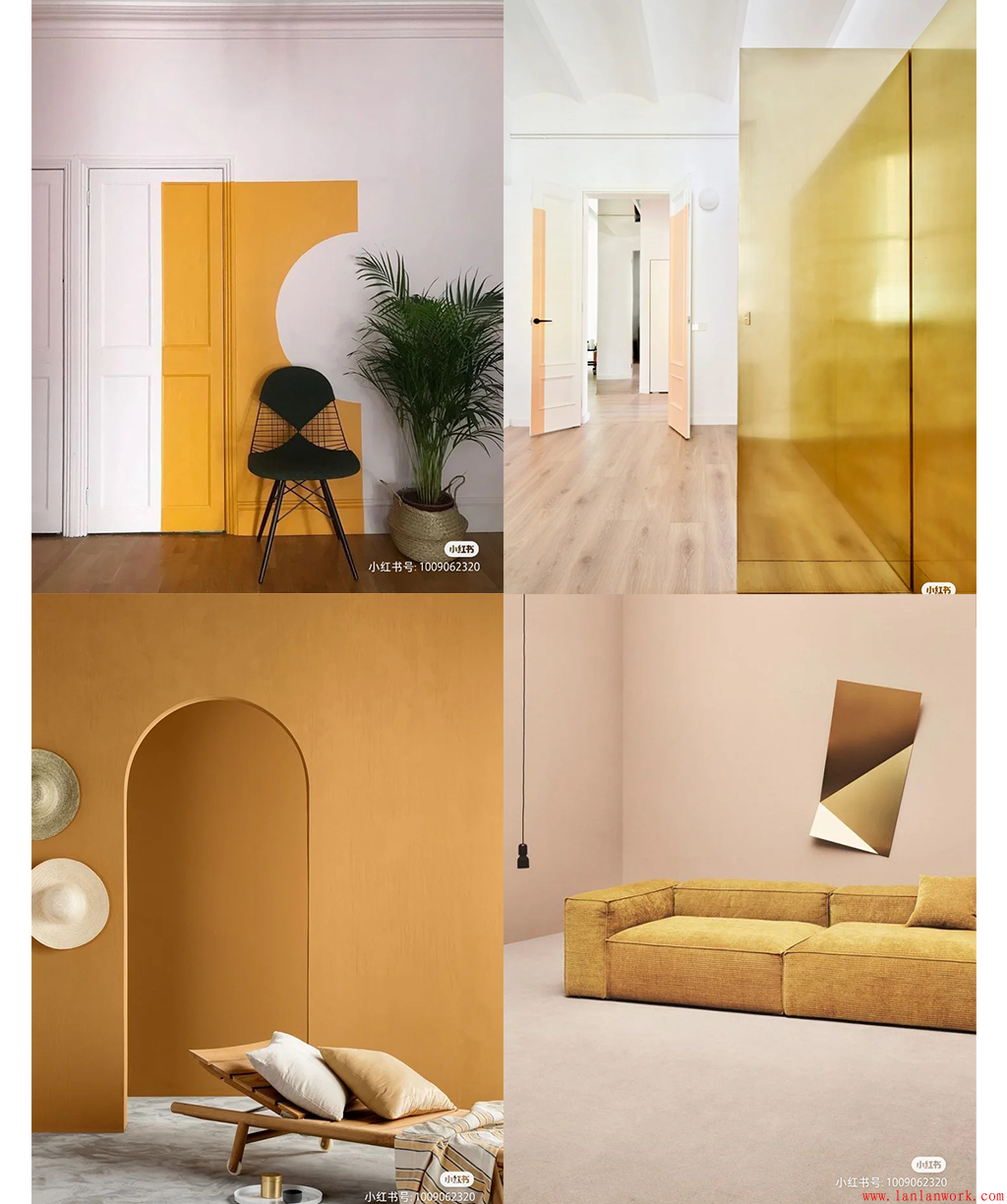 古今中外,不管是建筑還是著裝,金黃色一直是富貴華美的象征。上面一組家居裝飾,分別從黃色系中汲取顏色,或亮黃色,或金黃色,或金色,用于門(mén)、墻壁、地板、樓梯、沙發(fā)、椅凳的色彩搭配,甚至屋內(nèi)的女主人也穿著金黃色的服飾和裙裝,高貴奪目的氣質(zhì)不言而喻。而不同飽和度和明度的黃色和金色用在木質(zhì)的實(shí)色門(mén),玻璃的半透明門(mén),水泥的墻壁,布藝的沙發(fā)上,又各有千秋。