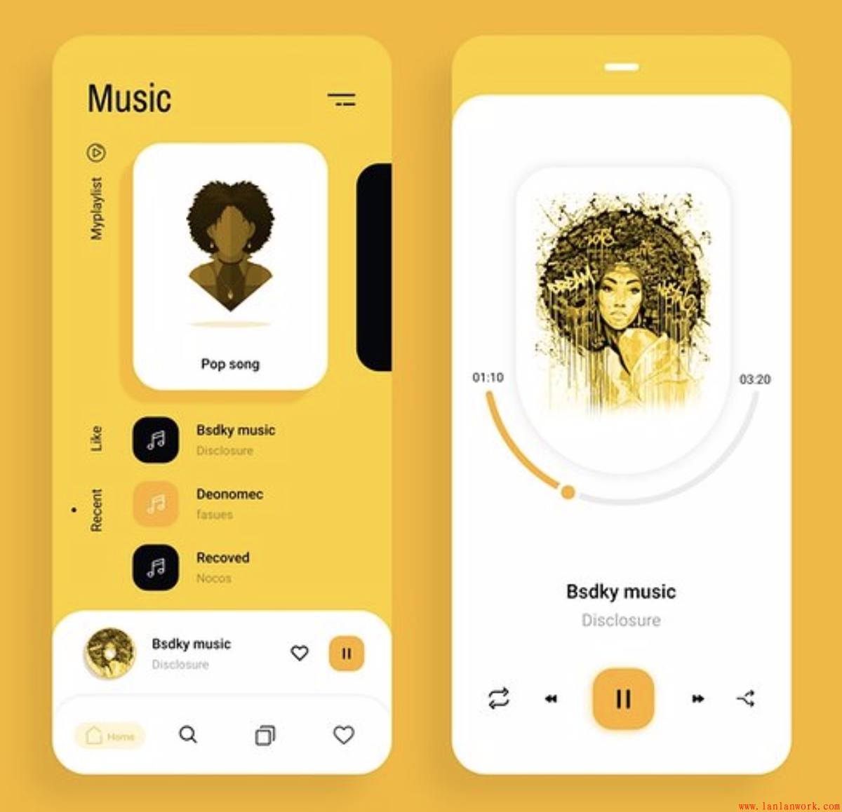 這是一個(gè)音樂(lè)APP,同前一個(gè)界面一樣,主頁(yè)的背景整屏是亮麗黃,卡片帶不同飽和度和明度的投影。按鈕和鼠標(biāo)懸停狀態(tài)為黃色,有突出強(qiáng)調(diào)的作用。時(shí)間軸黃色和灰色相間。整體明朗的同時(shí),增添柔和的色彩,讓人在這個(gè)音樂(lè)APP上流連忘返。