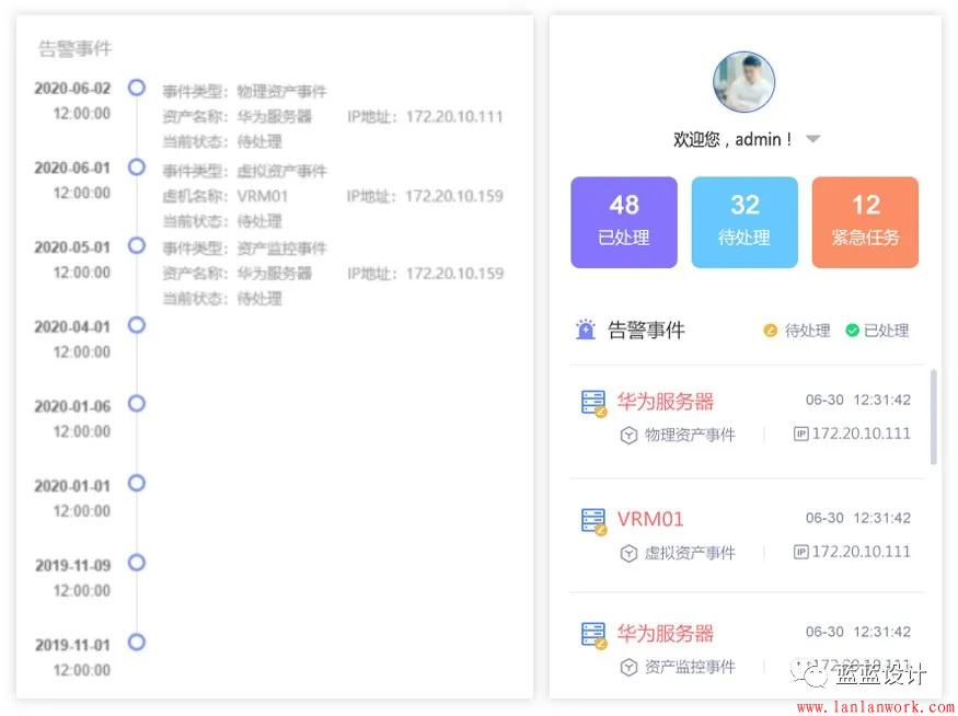 1. 理解用戶所需,優(yōu)化交互,增加部分內(nèi)容。告警事件除了原型中的時間線按順序發(fā)生外,加了用戶頭像,已處理、待處理、緊急任務(wù)統(tǒng)計數(shù)字,讓用戶可以總覽全局,做到對工作量心中有數(shù)。