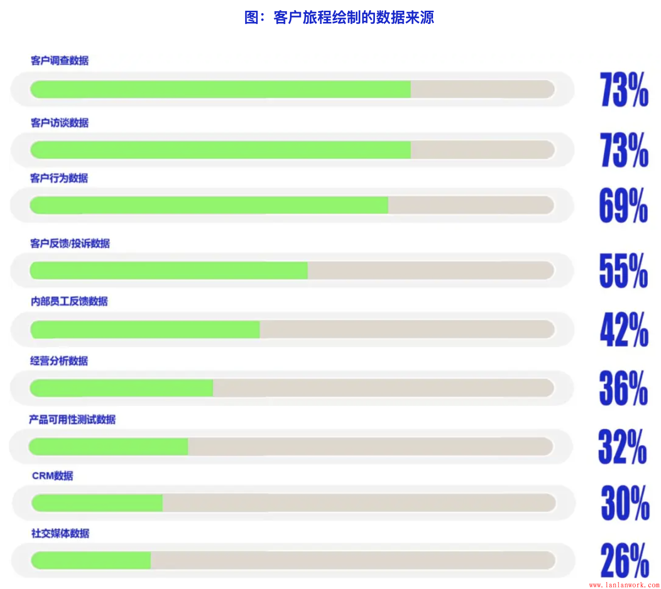 在繪制客戶旅程的過(guò)程中,目前主要用的是客戶調(diào)查數(shù)據(jù)和客戶訪談數(shù)據(jù),這也是客戶研究團(tuán)隊(duì)最擅長(zhǎng)和最容易采集的數(shù)據(jù)。其次最常用的數(shù)據(jù)來(lái)源是客戶行為和客戶反饋/投訴數(shù)據(jù),總體上對(duì)外部數(shù)據(jù)應(yīng)用多于內(nèi)部數(shù)據(jù),對(duì)小數(shù)據(jù)多于大數(shù)據(jù)。
