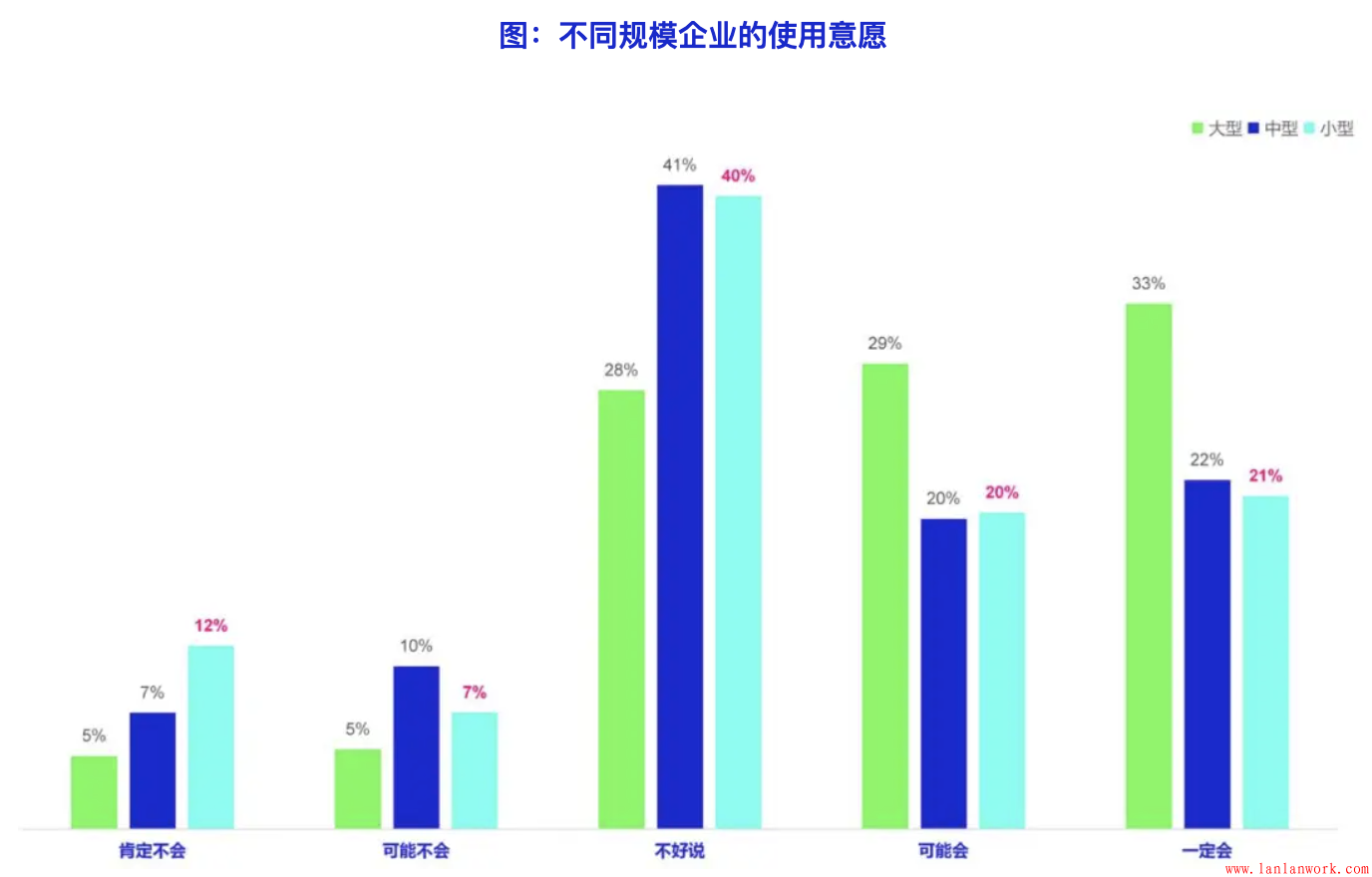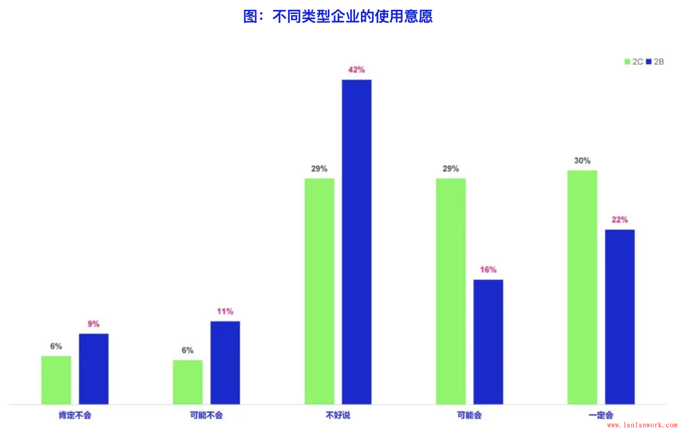 不同類型的企業(yè)未來(lái)使用客戶旅程方法的可能性也存在明顯差異。使用客戶旅程越久、使用頻率越高,獲得的效果越好的企業(yè),繼續(xù)使用客戶旅程方法的傾向越高。2C企業(yè)比2B企業(yè)未來(lái)更愿意使用客戶旅程,雖然2B企業(yè)獲得效果更明顯,但2B企業(yè)使用客戶旅程的難度和成本更多到,導(dǎo)致2B企業(yè)的使用意愿要明顯低于2C企業(yè)。另外,相對(duì)于中型和小型企業(yè),大型企業(yè)的使用意愿明顯更高,表示可能會(huì)使用的比例達(dá)到了61%,明顯高出中小型企業(yè)。