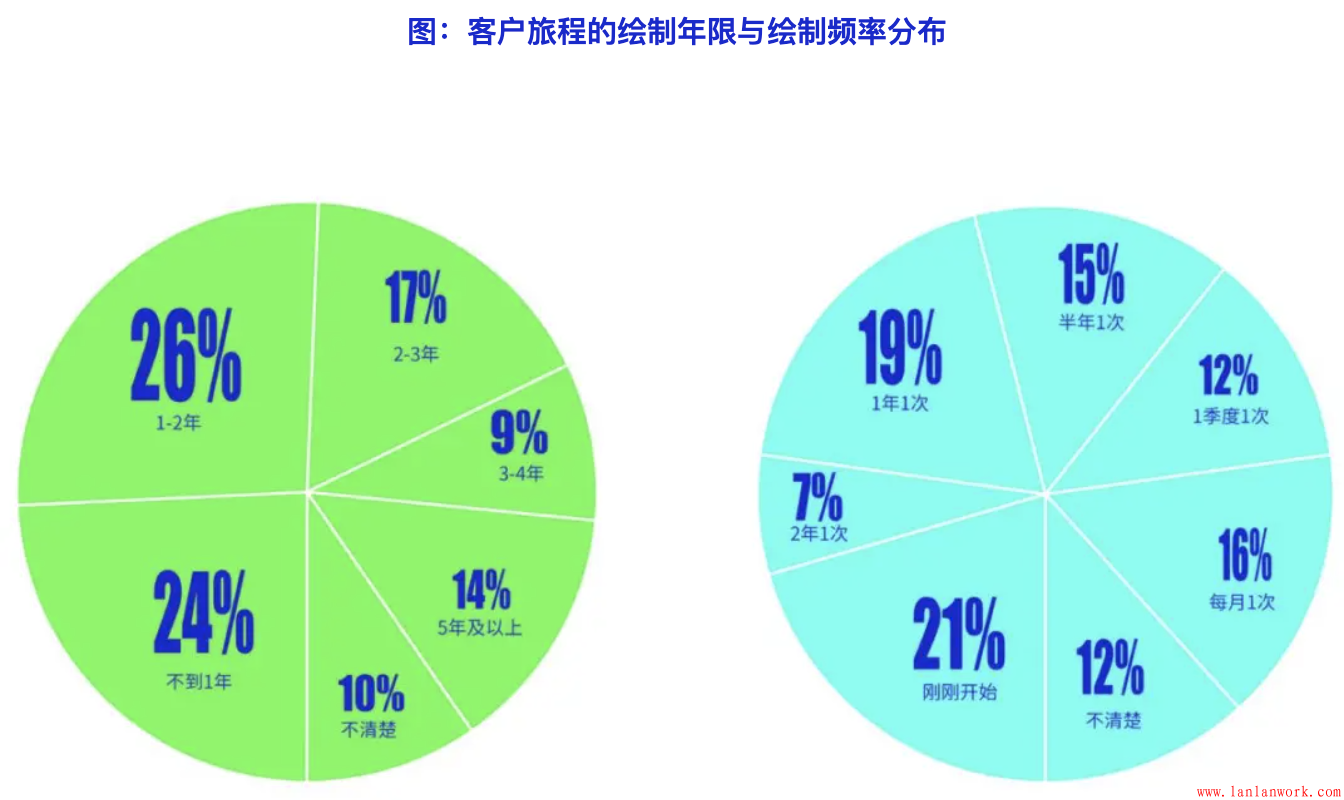 企業(yè)對(duì)客戶旅程總體的認(rèn)知與應(yīng)用比例為25%,屬于初期水平。2C類企業(yè)、大型企業(yè)、金融行業(yè)對(duì)客戶旅程的認(rèn)知和應(yīng)用水平明顯高于其他類型的企業(yè)。大多數(shù)企業(yè)在最近兩年才開(kāi)始嘗試客戶旅程方法,主要由研究、設(shè)計(jì)、客服部門(mén)在主導(dǎo)客戶旅程的應(yīng)用,客戶旅程地圖的繪制頻率大部分是每年或半年繪制一次。