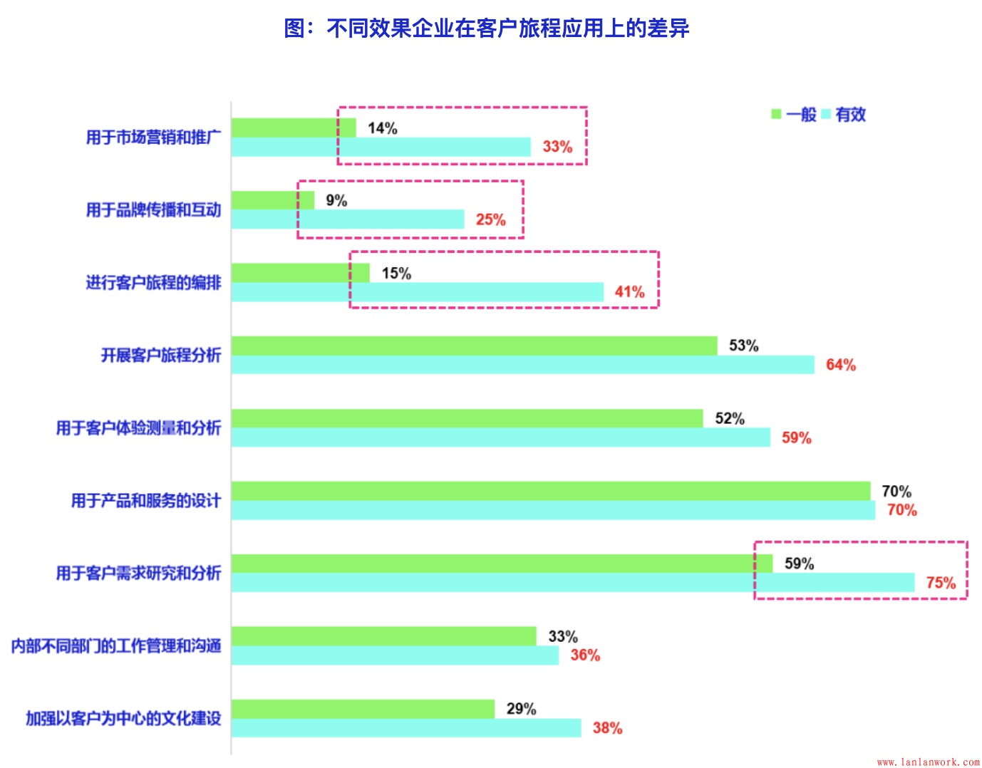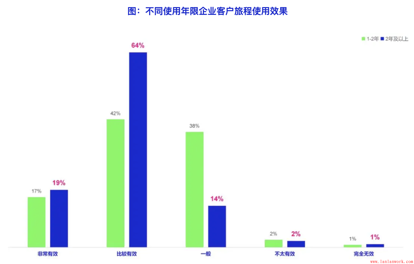 客戶旅程在不同領(lǐng)域的應(yīng)用對(duì)最終的效果有明顯的影響:表示客戶旅程應(yīng)用效果一般的企業(yè)在各個(gè)具體應(yīng)用領(lǐng)域的應(yīng)用比例均低于獲得明顯效果的企業(yè)。效果一般的企業(yè)在客戶需求研究和分析、客戶旅程編排、市場(chǎng)營(yíng)銷和推廣,以及品牌傳播與互動(dòng)方面的應(yīng)用差距最大(落后超過(guò)10%的比例)。從調(diào)查數(shù)據(jù)來(lái)看,雖然用于編排、營(yíng)銷和品牌的總體比例不高,但確實(shí)影響最終應(yīng)用效果的顯著因素。