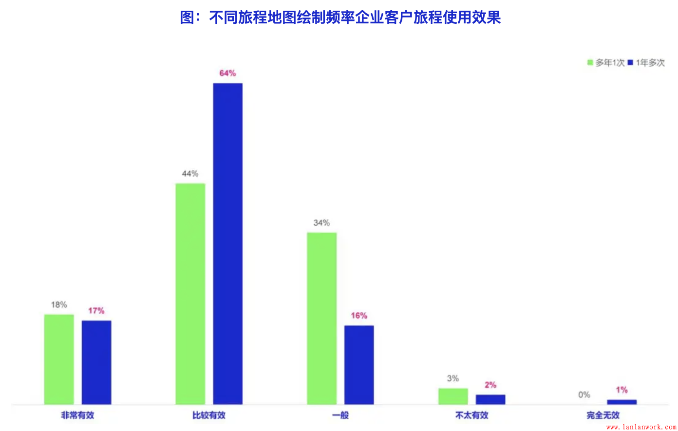 不同情況下,客戶旅程的應(yīng)用效果也不盡相同。調(diào)查數(shù)據(jù)顯示,使用客戶旅程方法時(shí)間越長(zhǎng),繪制客戶旅程地圖頻率越高,客戶旅程方法取得的效果越好。使用2年以上的企業(yè)和2年以下的企業(yè)表示有效的比例(包括“比較有效”和“非常有效”,下同)分別為83%和69%;每年繪制多次客戶旅程地圖的企業(yè)和多年繪制一次地圖的企業(yè)的表示有效的比例分別為81%和62%。