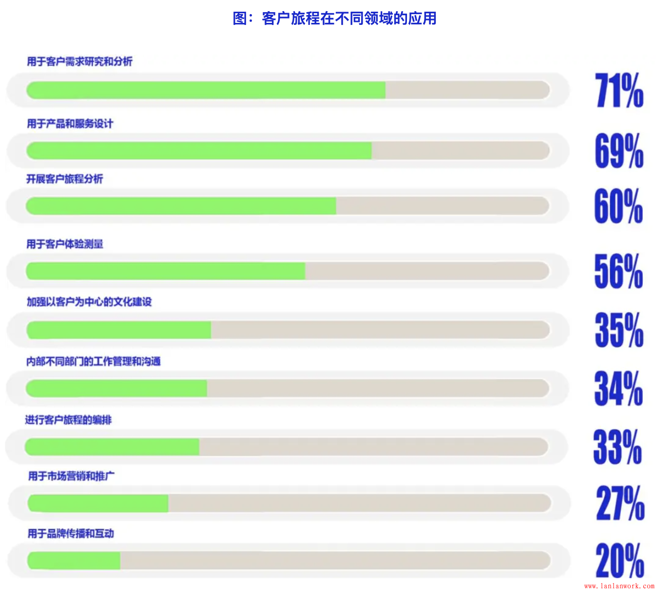 在將客戶旅程方法進(jìn)行具體應(yīng)用時(shí),最常見(jiàn)是用于客戶需求分析、產(chǎn)品和服務(wù)設(shè)計(jì)、客戶旅程分析和測(cè)量。其次是在企業(yè)文化建設(shè)、工作管理和溝通方面的應(yīng)用。在具體操作層面,例如客戶旅程編排、營(yíng)銷和互動(dòng),目前也有一定比例的具體應(yīng)用。隨著客戶旅程方法應(yīng)用的進(jìn)一步深入,直接到操作層面的應(yīng)用將逐步提升。