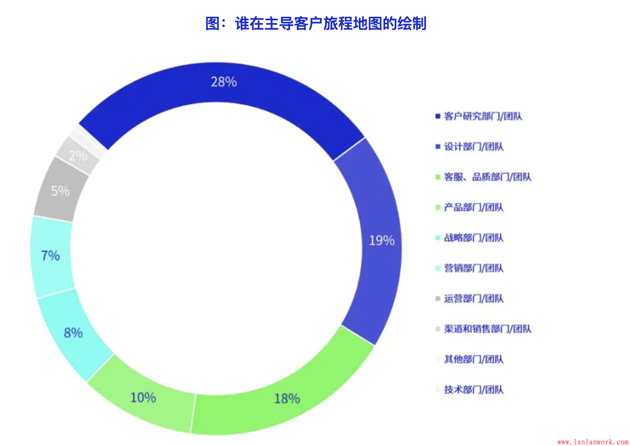 由客戶研究部門(mén)和團(tuán)隊(duì)主導(dǎo)客戶旅程的繪制時(shí)目前的最常見(jiàn)的模式,其次是設(shè)計(jì)部門(mén),以及客服、品質(zhì)部門(mén)主導(dǎo)。但產(chǎn)品、戰(zhàn)略、營(yíng)銷、銷售部門(mén)主導(dǎo)的情況也一定的比例,這也說(shuō)明目前開(kāi)展客戶旅程應(yīng)用的企業(yè),其目的存在多樣性。不同部門(mén)來(lái)主導(dǎo),其方法和應(yīng)用上也會(huì)存在差異。