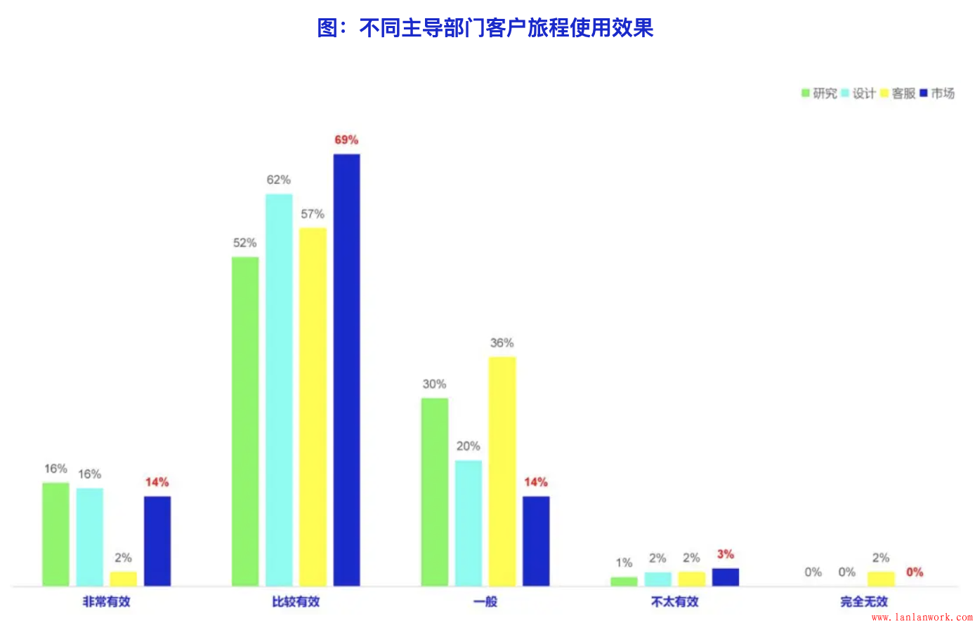 雖然目前由市場(chǎng)部門(mén)(包括營(yíng)銷、銷售和品牌部門(mén))主導(dǎo)的比例較少,但由市場(chǎng)部門(mén)主導(dǎo)客戶旅程應(yīng)用獲得效果明顯好于其他部門(mén)主導(dǎo)的情況,由客服部門(mén)主導(dǎo)的效果低于其他部門(mén)。這與MyCustomer在2018年在歐美的研究結(jié)論相反,這可能說(shuō)明市場(chǎng)部門(mén)在客戶體驗(yàn)領(lǐng)域的主導(dǎo)權(quán)在逐步上升。