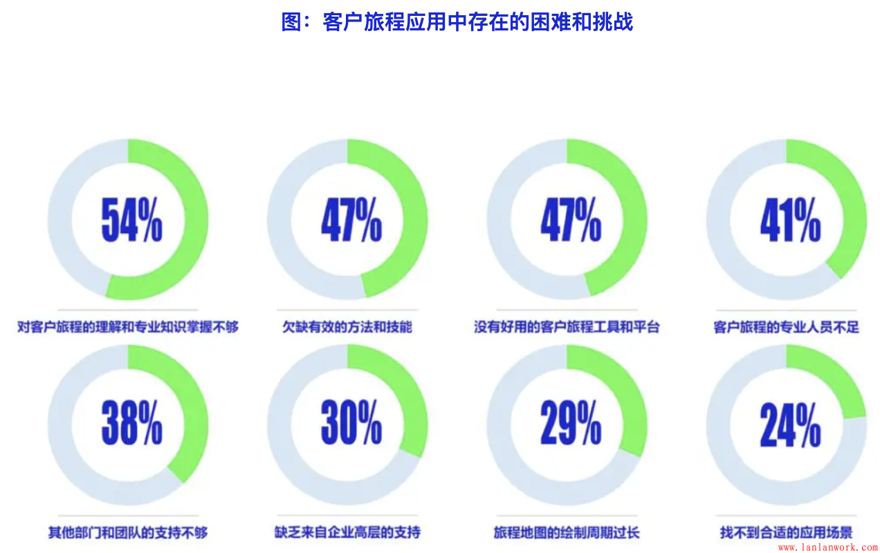 對(duì)于在客戶旅程應(yīng)用過(guò)程中的挑戰(zhàn),最大的困難不是預(yù)算不足,而是知識(shí)、方法、技能、工具和人員的欠缺和不足,尤其是專業(yè)知識(shí)和方法的掌握不夠,是最大的兩項(xiàng)困難。其次碰到的問(wèn)題是企業(yè)高層,以及其他部門(mén)的支持不夠。