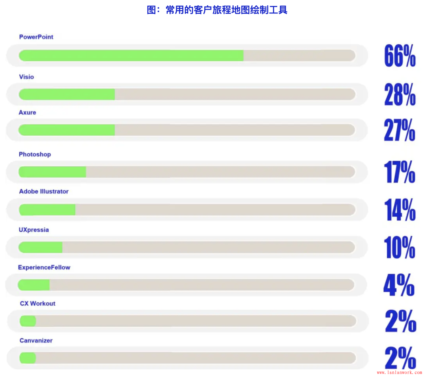 在客戶旅程地圖繪制工具方面,使用最多的是PowerPoint,處于絕對(duì)領(lǐng)先的地位;其次是常用的繪圖和設(shè)計(jì)工具,例如Visio、Photoshop、Adobe Illustrator等;專用的客戶旅程地圖繪制工作使用比例非常低,最主要的客戶旅程地圖專用繪制工具UXpressia的使用比例也只有10%,其他的則更低,使用比例只有2%-4%。主要是目前客戶旅程地圖繪制并不是一項(xiàng)常見(jiàn)工作,所以通用型的文編編輯和繪圖工具會(huì)是常用選擇,而目前的客戶旅程地圖繪制工具多為英文版本,國(guó)內(nèi)還沒(méi)有出現(xiàn)較好的客戶旅程地圖繪制工具,這也是客戶旅程地圖專用工具使用比例較低的重要原因。