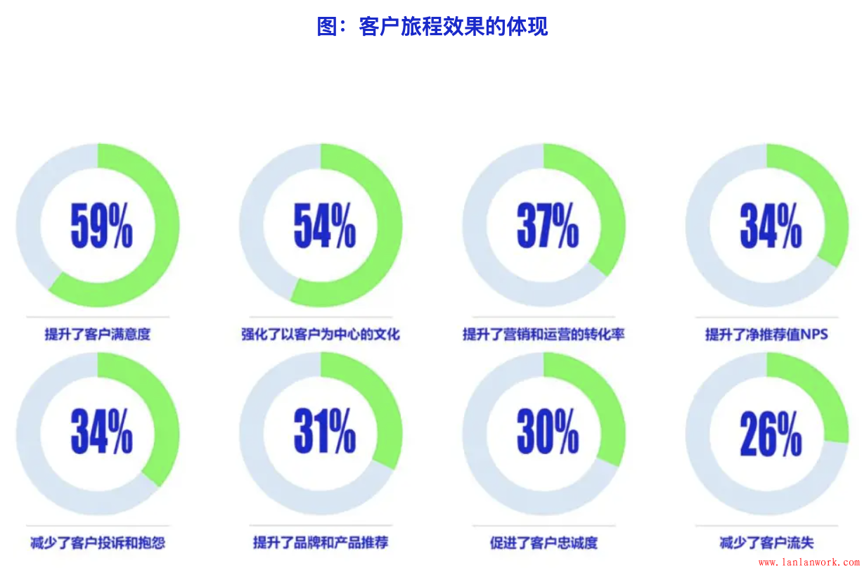 通過(guò)以上在不同領(lǐng)域的應(yīng)用,客戶旅程方法在各個(gè)方面的效果都有所體現(xiàn),尤其是在提升客戶滿意度、強(qiáng)化以客戶為中心的企業(yè)文化、提升營(yíng)銷和運(yùn)營(yíng)的轉(zhuǎn)化率方面最為明顯,分別由59%、54%和37%的企業(yè)表示在這三個(gè)方面得到了提升。