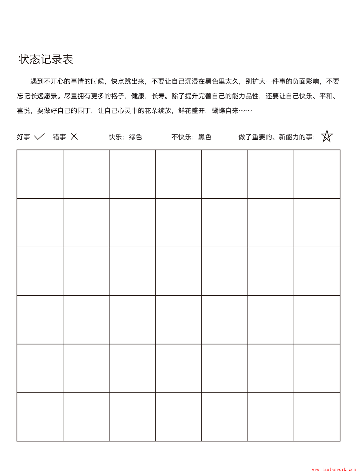 還有一種填色法,以快樂和不快樂來分,可以把自己人生想象成三萬天三萬個小格子,當你平靜喜悅的時候,你的格子里的顏色是綠色,當你悲傷,憤怒,崩潰的時候,你的格子里的顏色就是黑色。遇到不開心的事情的時候,快點跳出來,不要讓自己沉浸在黑色里太久,別擴大一件事的負面影響,不要忘記你的長遠愿景。
