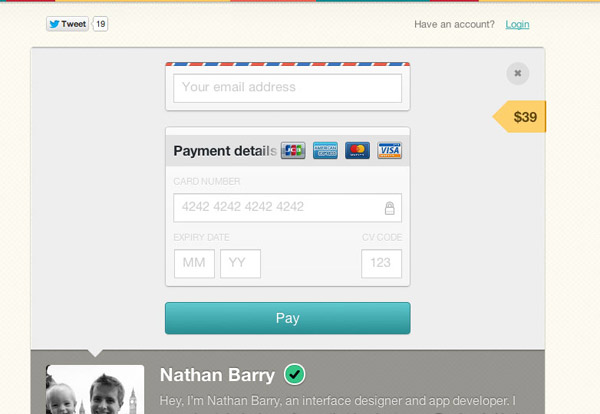 Gumroad在未登錄狀態(tài)的支付表單中剔除了很多常見的“必填”字段,最終只保留了用于輸入郵箱地址、信用卡號、有效期和CV碼的文本框。如果連未登錄時的支付環(huán)節(jié)都可以被如此簡化,我相信對于其他方面業(yè)務的那些復雜表單來說,不會沒有優(yōu)化空間的。