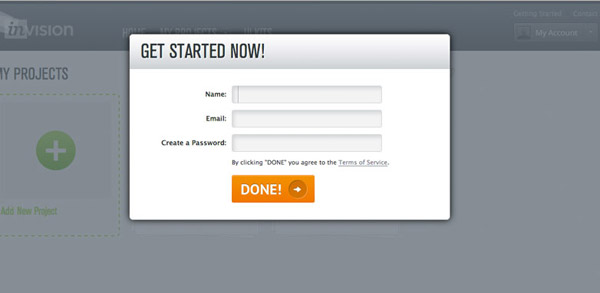 在對表單進行了充分的簡化之后,我們還可以試著通過一些設計技巧讓填寫表單的環(huán)節(jié)看上去更輕量。在這方面,我個人最喜歡的一個案例來自原型制作工具InVision的注冊表單。他們使用浮層的形式呈現(xiàn)表單,作為訪問者,我可以感知到,當我填寫完成之后就可以立刻回到之前的界面繼續(xù)應用流程。