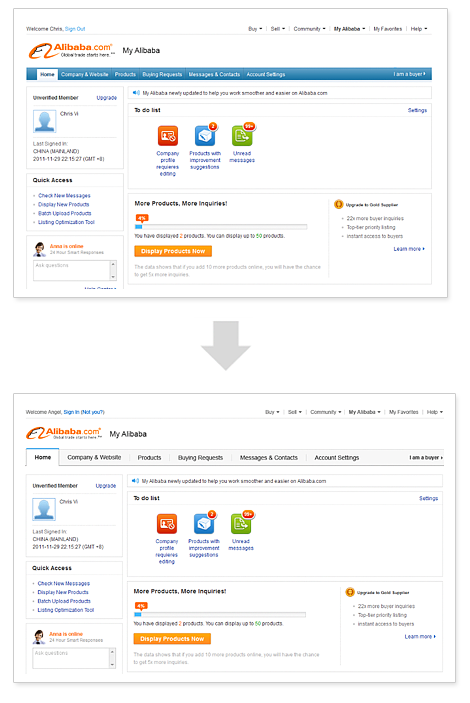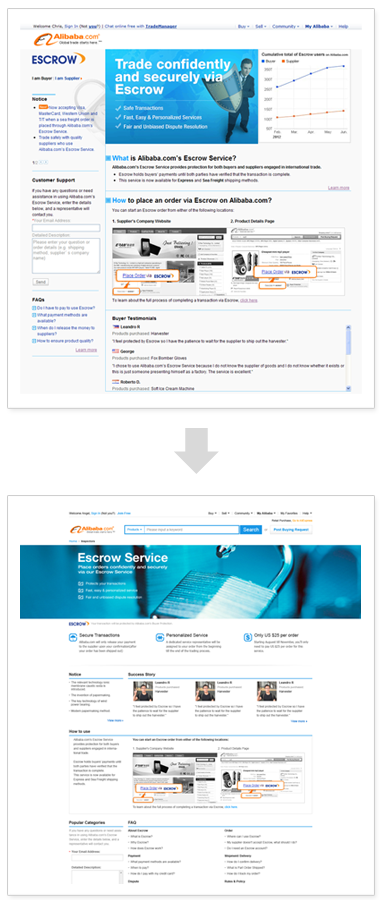 上圖我們團隊對alibaba.com提供的服務介紹頁面進行改版的項目,改版前的設計層級區(qū)分不明顯,使得用戶進入該頁面時不能快速了解服務的概況,來判斷是否繼續(xù)深入了解;而改版后通過大小的對比,呈現抓住用戶第一眼印象的信息,初步判斷符合自己的需求,用戶才會繼續(xù)瀏覽。