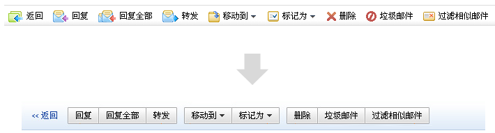 上面的是我們外貿郵界面目前的狀態(tài),所有的操作都并列擺放,隨著功能的增多,用戶識別的效率大大降低,優(yōu)化的方案是將相關的操作進行分組,正是運用關聯(lián)和并列的信息關系進行設計