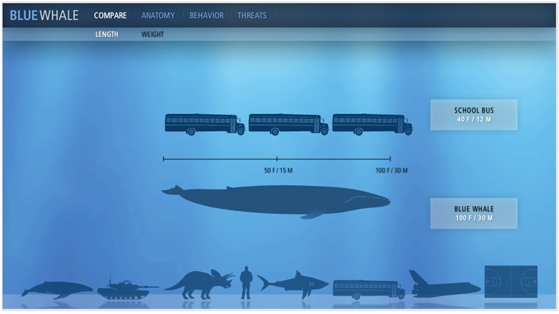 舉個例子:國家地理藍鯨網站 為了呼吁保護藍鯨,首先要讓人們了解藍鯨的特征及當前的威脅,網站通過動態(tài)的將藍鯨與其他生物和人造物進行對比,形象直觀的傳達藍鯨的重量、大小,加上視頻展示目前藍鯨的主要生活威脅,用戶即使不閱讀文字也能大致明白網站想要傳達的信息