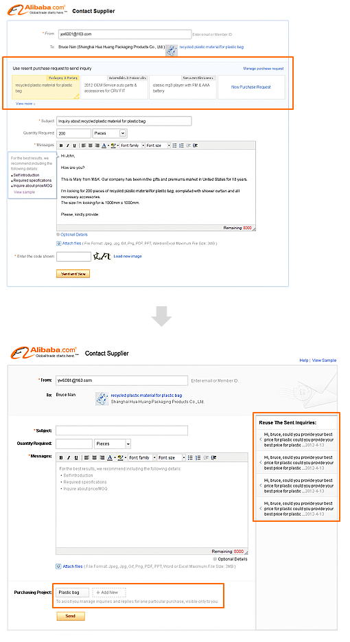 下面左圖框出部分是增加的功能,希望買家在發(fā)詢盤給供應商時能對當前的采購需求建組并復用上次的內容,在內部討論時,大家都覺得要強化該選項,讓它成為其他內容的統(tǒng)領,然而調研的結果卻大相徑庭,用戶無法理解這塊內容或干脆以為是貼的廣告內容而忽略;