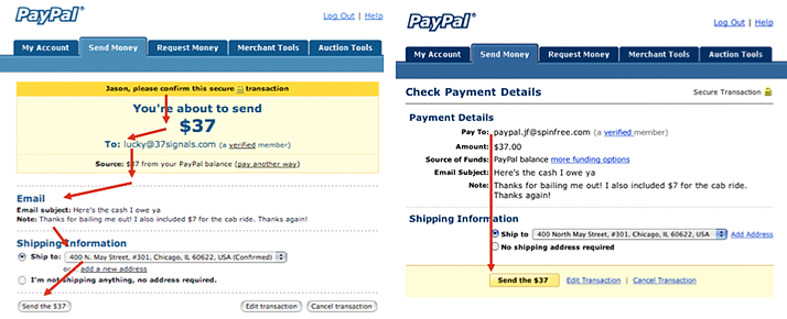 下圖是PayPal支付頁面的一次優(yōu)化過程,老版視覺雖然有層級區(qū)別,卻打亂了完成任務的視線順序,優(yōu)化后強調行動點,行動前的視覺順序在同一方向上,順序的關系很明顯,能提升用戶的任務完成率。