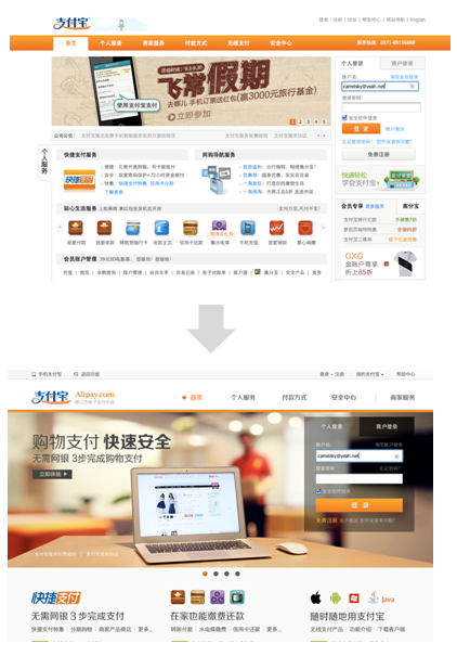 支付寶近期在測試新版首頁,我們來到支付寶首頁最常進行的操作就是登錄,而老版首頁視覺第一焦點是導航及活動推廣位,導航只要在固定的位置,用戶在需要時能找到就已經達到目的了,它不應該成為頁面的視覺焦點,除非用戶經常在導航進行切換以了解網站提供的服務,在這點上新版首頁弱化了導航及其他應用入口,強化支付寶本身的品牌傳達及登錄行為,很符合主流用戶的行為習慣