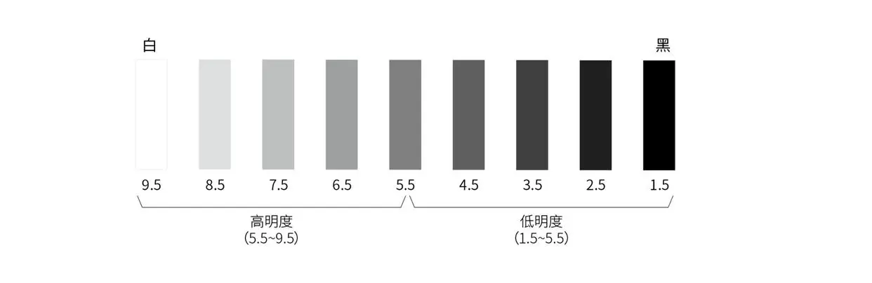 CCS 色彩體系將明度分為 17 級(jí),每 0.5 級(jí)為一個(gè)階梯。為了方便理解,我們也可以粗略地分為 9 級(jí),黑為 1.5,白為 9.5;以 5.5 級(jí)灰為中間點(diǎn),1.5~5.5 為低明度,5.5~9.5 為高明度。明度差越大顏色對(duì)比越明顯,明度差越小則對(duì)比越弱。