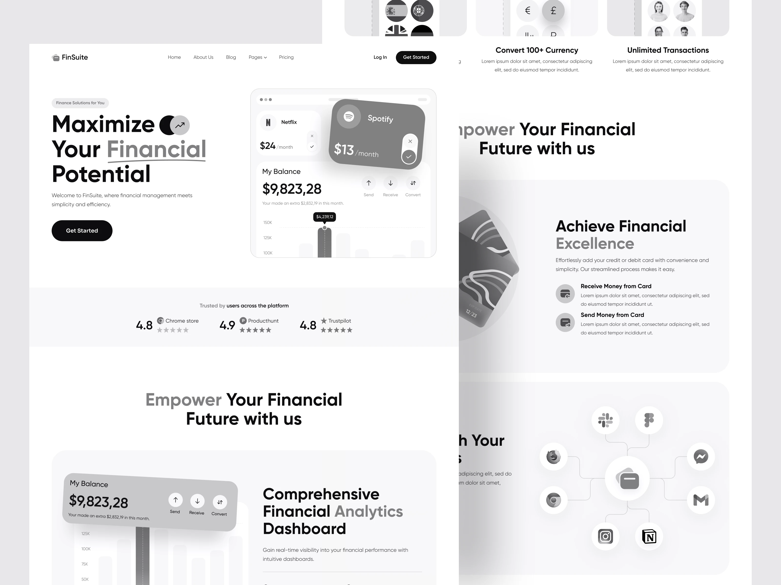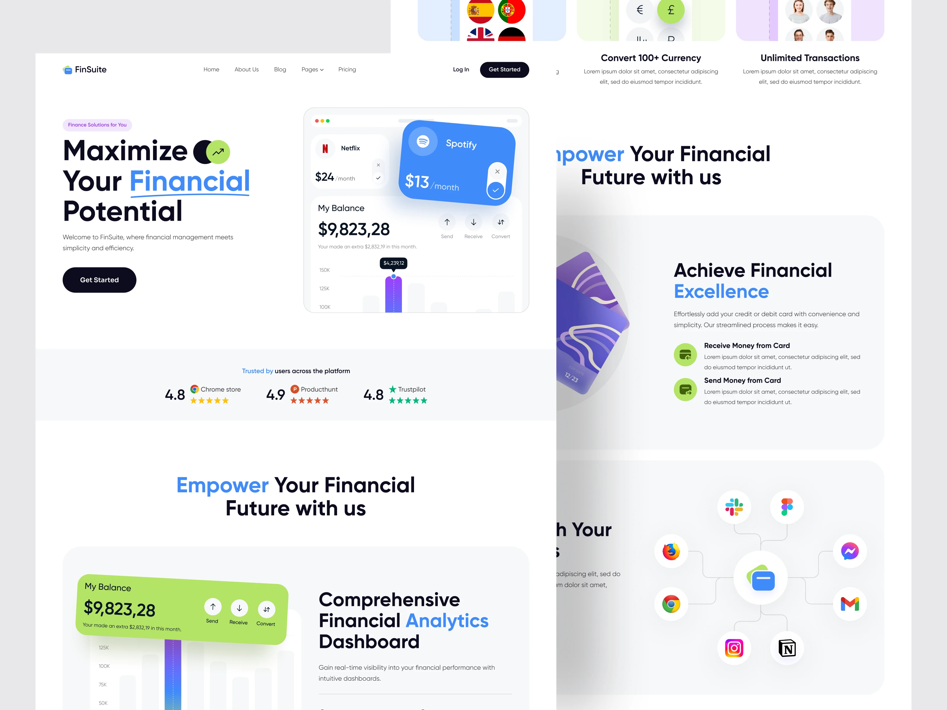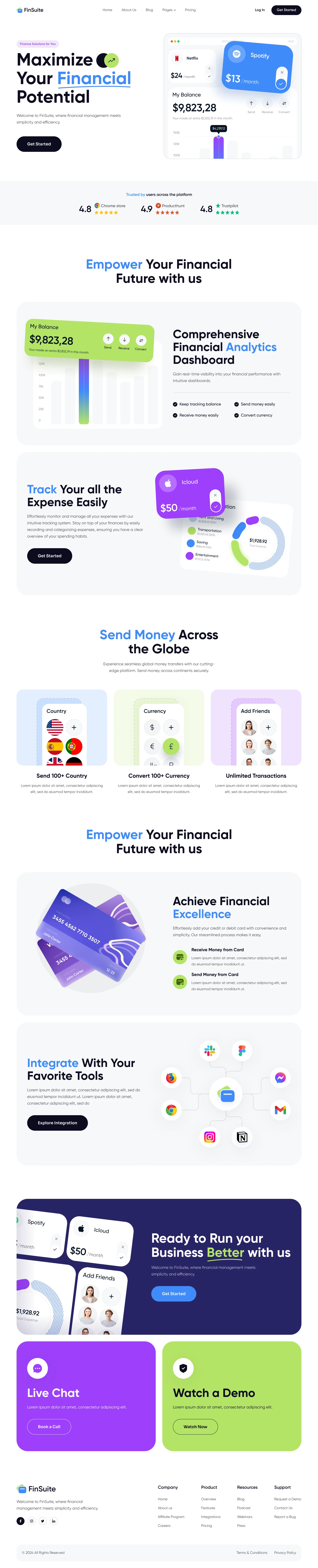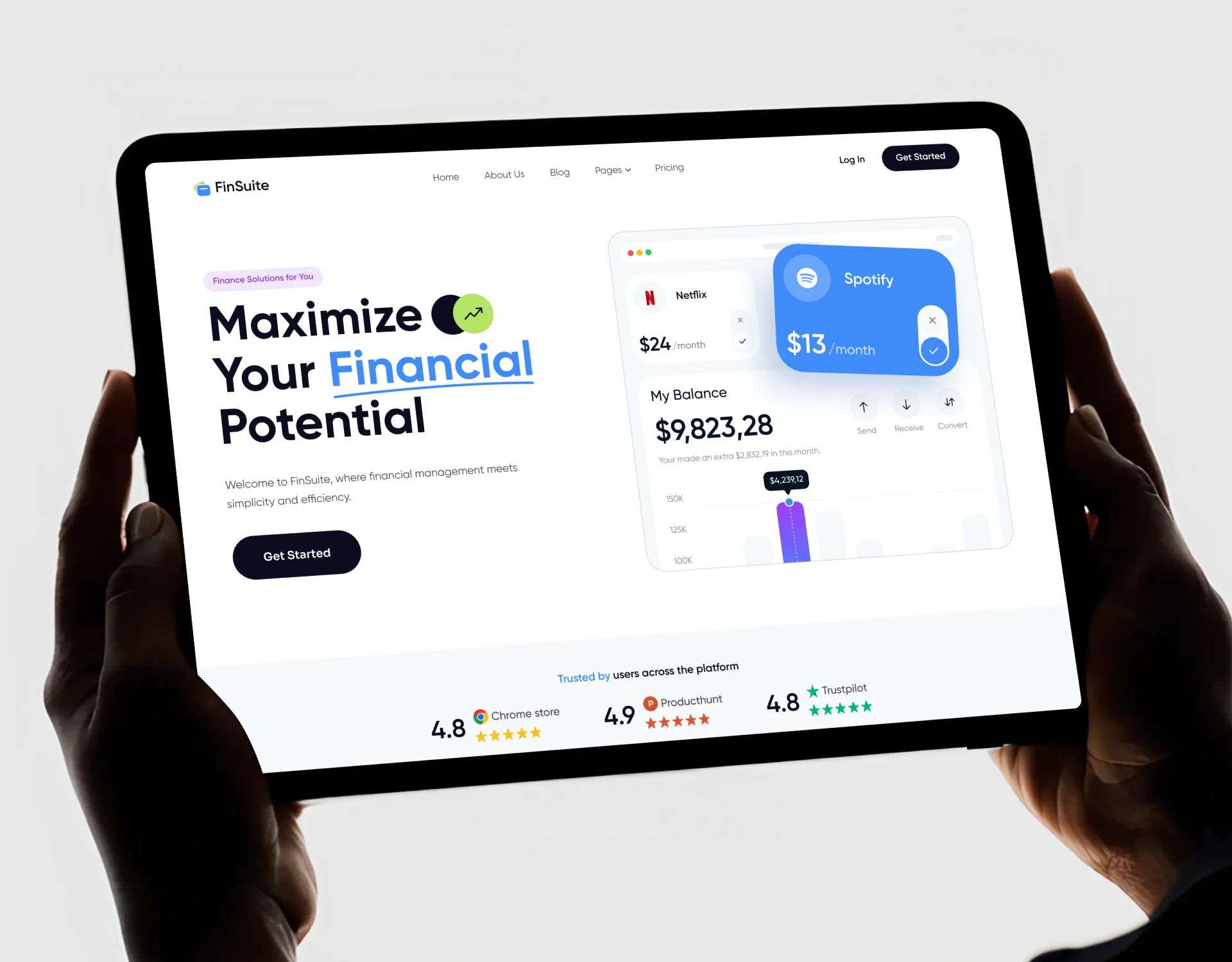 Hero 區(qū):大標(biāo)題 + 產(chǎn)品截圖 → 直接傳達(dá)核心價(jià)值(Maximize your financial potential)。
