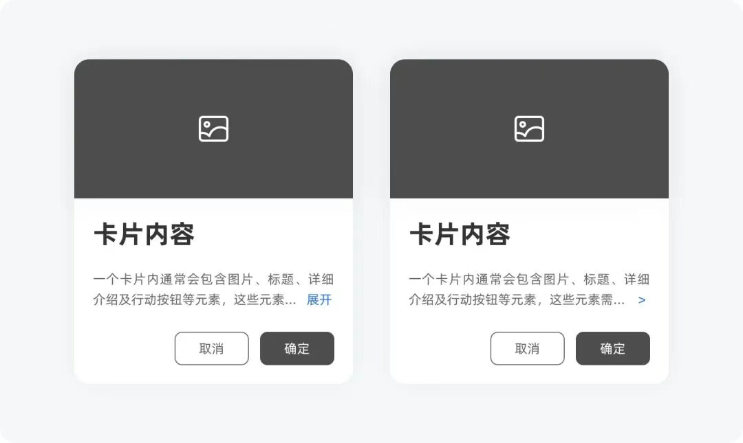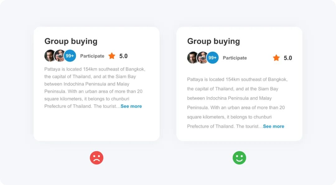一個(gè)卡片內(nèi)通常會包含圖片、標(biāo)題、詳細(xì)介紹及行動按鈕等元素,這些元素需要以聚焦的形式去呈現(xiàn),以幫助用戶快速掃描內(nèi)容。當(dāng)文本內(nèi)容較長、展示的信息過多時(shí),不利于用戶快速掃描,導(dǎo)致用戶無法在第一時(shí)間快速感知到產(chǎn)品想要展示的、或用戶想要知道的信息,很容易被用戶過濾。