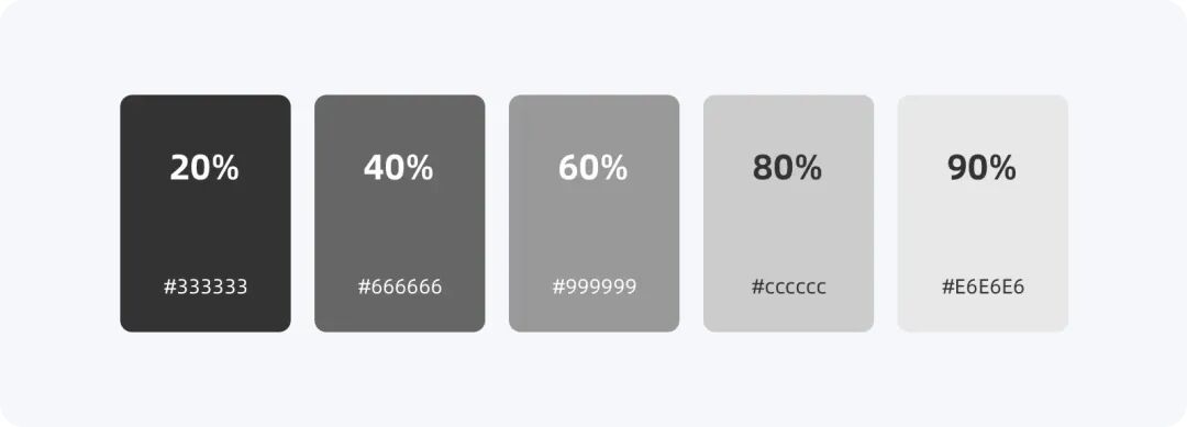 中性色即色彩中的黑白灰,設(shè)定中性色是由調(diào)整HSB(色相/飽和度/亮度)中的B值高低里形成一個(gè)表現(xiàn)視覺強(qiáng)弱的等級階梯,一般設(shè)定4~5個(gè)等級即可,例如B值的20%(#333333)、40%(#666666)、60%(#999999)、80%(#CCCCCC)、90%(#E6E6E6)。