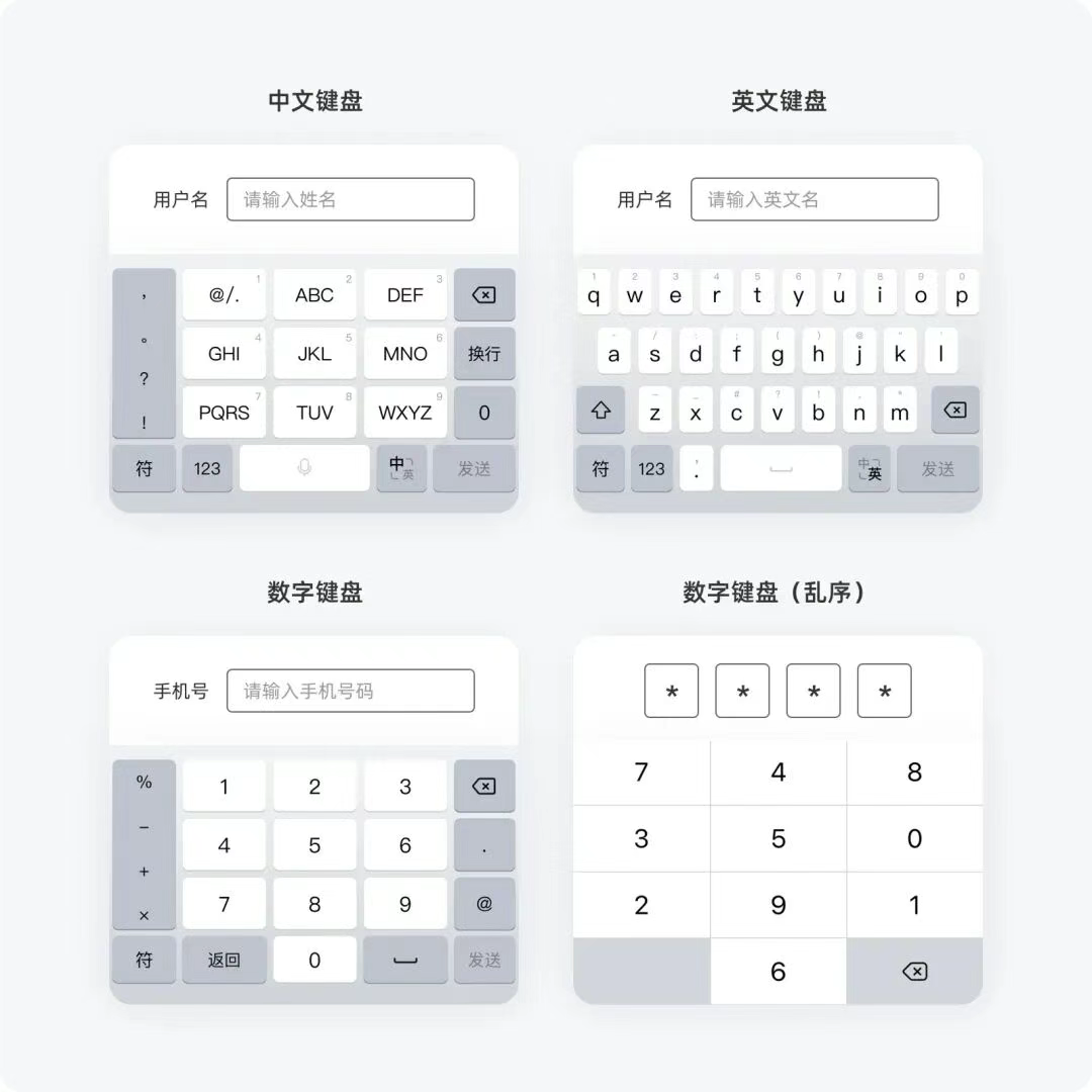為了簡化數(shù)據(jù)輸入,滿足不同的類型的文本輸入需求,用戶在輸入不同類型的字段時(shí),應(yīng)提供對應(yīng)類型的鍵盤,便于用戶更快完成表單內(nèi)容,常見的鍵盤有以下幾種: