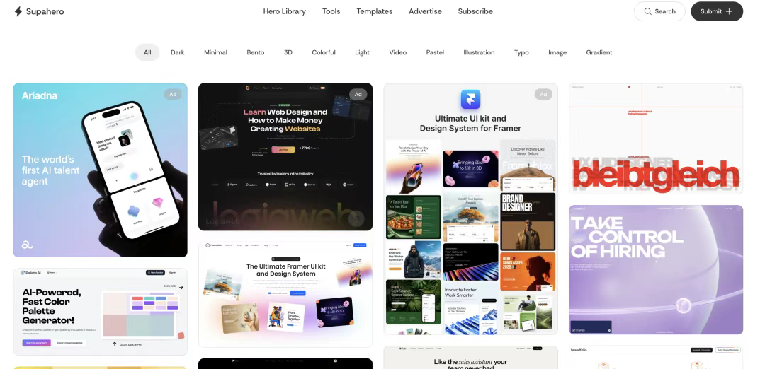 [Supahero](http://supahero.io) 專注于網(wǎng)站最重要的部分之一——英雄區(qū)(Hero Section)設(shè)計(jì)。這個(gè)區(qū)域通常是訪問者首先看到的部分,對于吸引用戶注意力至關(guān)重要。