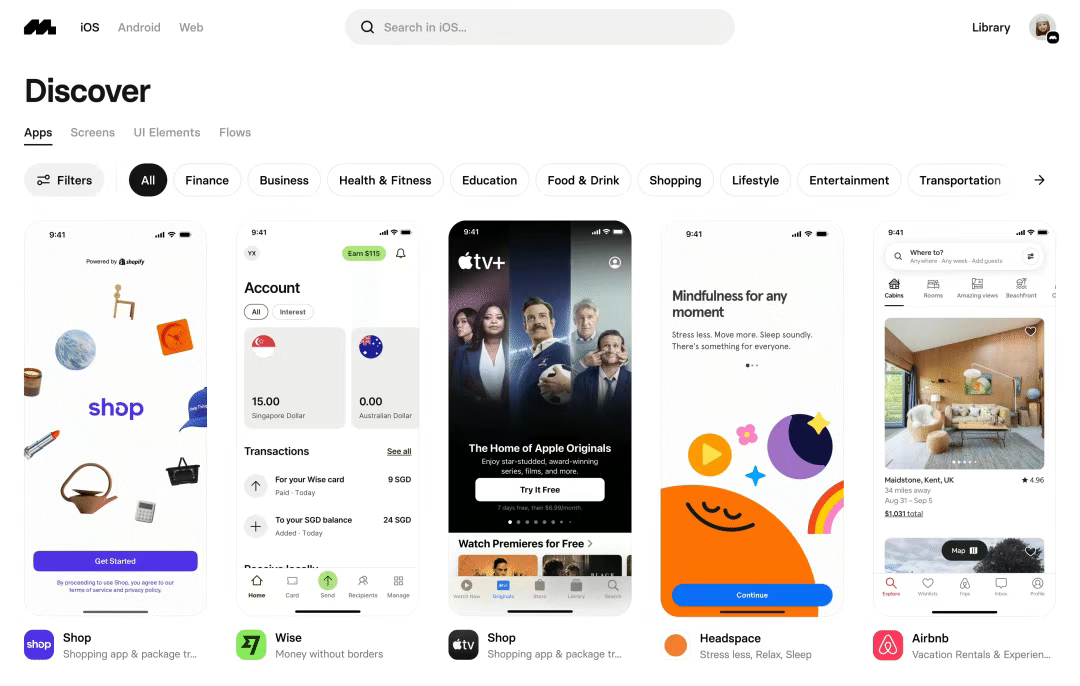 [Mobbin](http://mobbin.com) 是目前最大的UI/UX設(shè)計(jì)參考庫之一,提供了大量的移動應(yīng)用和網(wǎng)站界面設(shè)計(jì)案例。與其他平臺不同,Mobbin 不僅展示首頁設(shè)計(jì),還提供完整的用戶流程和交互設(shè)計(jì)參考。