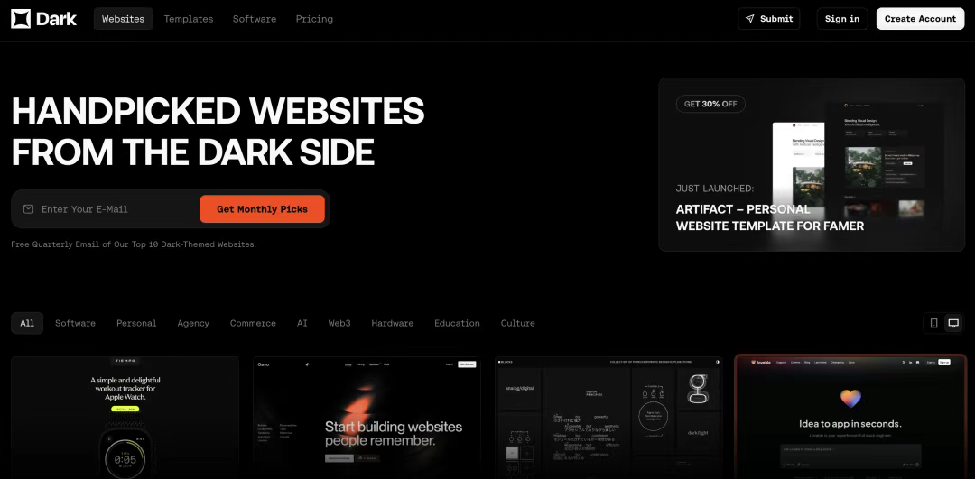 [Dark Design](http://dark.design) 專注于收集優(yōu)秀的暗色模式網(wǎng)站設(shè)計(jì)。隨著暗色模式在各種平臺上的普及,這個(gè)資源變得越來越有價(jià)值。