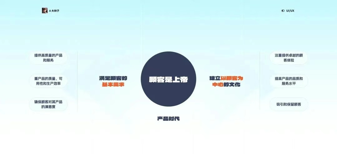 產(chǎn)品時(shí)代(用戶思維初局):這個(gè)階段的核心理念是顧客是上帝,關(guān)注點(diǎn)主要集中在產(chǎn)品本身,追求滿足用戶的基本需求,建立了最初的用戶關(guān)系。