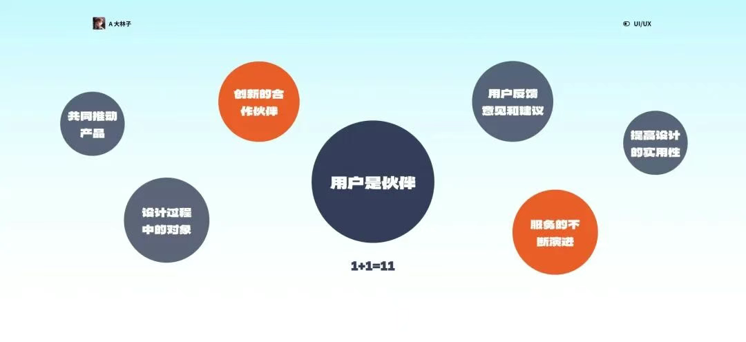 4. 明確4:用戶是伙伴:「1+1=11」 「以用戶為中心」的設(shè)計(jì)理念將用戶視為產(chǎn)品設(shè)計(jì)的伙伴,強(qiáng)調(diào)用戶參與的重要性。這不僅是在產(chǎn)品的使用中,更是在產(chǎn)品的設(shè)計(jì)過程中,通過用戶的參與,設(shè)計(jì)團(tuán)隊(duì)能夠獲得更為豐富的創(chuàng)意和反饋,實(shí)現(xiàn)「1+1=11」的效果,將用戶的力量與設(shè)計(jì)團(tuán)隊(duì)的智慧相結(jié)合,創(chuàng)造出更為卓越的產(chǎn)品體驗(yàn)。