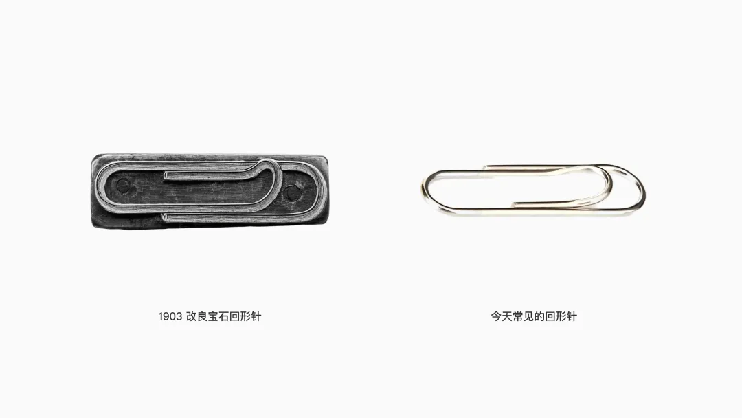 幾年后,喬治·W·麥吉爾(George W McGill)對寶石回形針做出了改良,進一步增大了內(nèi)環(huán)的弧度,使其更明顯地上翹。相比初代寶石回形針平緩的環(huán)圈末端,這種上揚的開口形成了更清晰的“示能”——直觀地提示用戶“此處可拉開并插入紙張”。在結(jié)構(gòu)上,它也實現(xiàn)了更省力的開合體驗。正是這一改良版本,逐漸演變成了今天最常見、最廣泛使用的回形針。