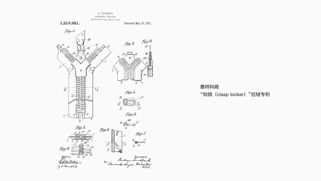 19 世紀(jì)末,在追求“效率”的工業(yè)時代背景下,拉鏈應(yīng)運而生。發(fā)明家惠特科姆(Whitcomb Judson)想解決傳統(tǒng)的系帶式高幫靴穿脫過于繁瑣這個問題,在芝加哥世界博覽會上展示了名為鉤鎖(clasp locker)的裝置,它的核心目標(biāo)很明確:用一次滑動,替代逐個系扣的繁瑣過程,節(jié)省時間。但當(dāng)時這種拉鏈依賴手工制作,成本較高,且質(zhì)量不夠穩(wěn)定,最終因為結(jié)構(gòu)缺陷及成本問題退出了市場。