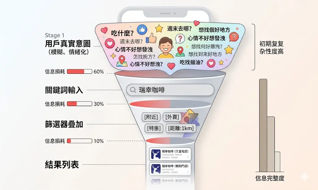 問題在于,這個翻譯過程存在天然的信息損耗。人類表達(dá)需求的方式是自然語言,是帶有情緒和上下文的整句話;但關(guān)鍵詞搜索要求的是最小化、去語境化的詞組。當(dāng)你把“想找一家適合帶父母的安靜粵菜館”壓縮為“粵菜 安靜”,你已經(jīng)丟失了“帶父母”所暗含的價值感需求——面子、正式感、停車便利、服務(wù)周到。這些維度,任何篩選器都覆蓋不到。